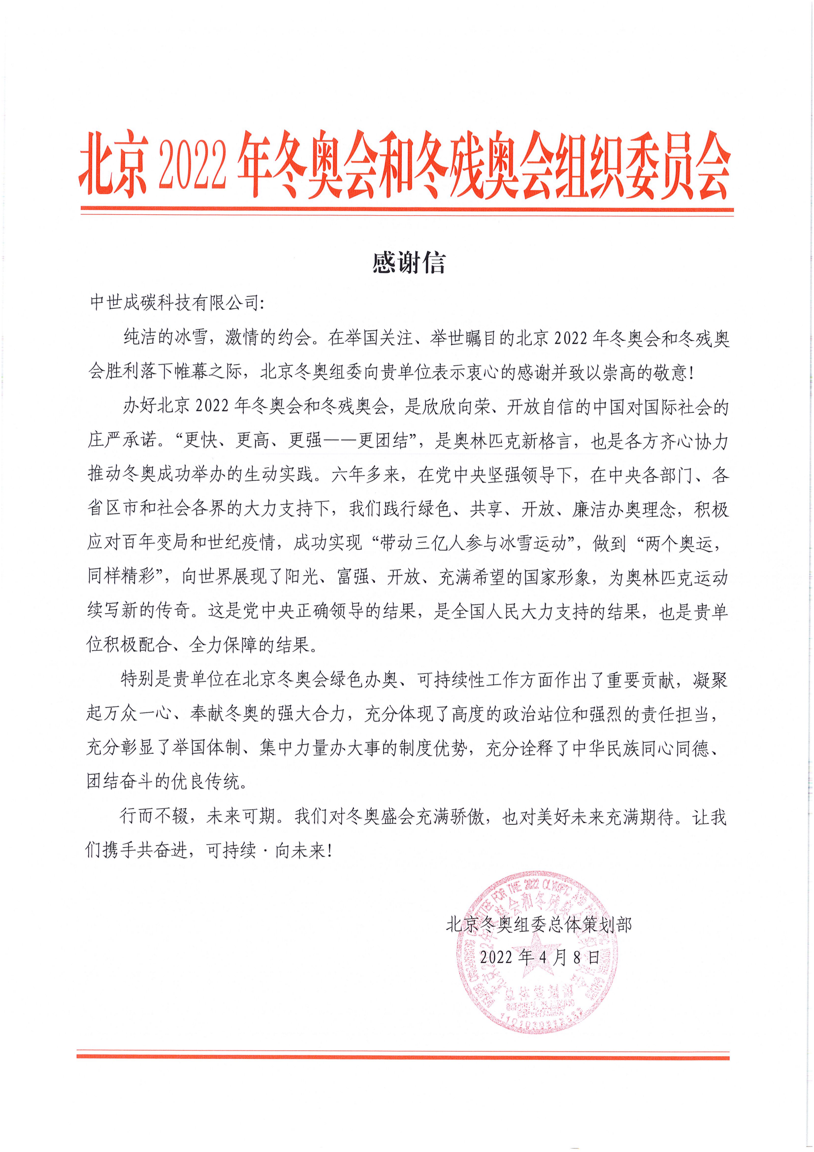 這份感謝,一方面代表著2022北京冬奧會和冬殘奧會對中世成公司技術實力的認可及對中世成所提供服務的認可;一方面源自中世成團隊對工作的執著認真、為祖國爭光的決心、著力服務綠色低碳可持續發展的使命擔當。董事長牛心電表示:“無論是服務于中國2030碳達峰2060碳中和這一偉大目標,還是服務于北京2022年冬奧會和冬殘奧會這一偉大盛會,對中世成而言都是重大的歷史機遇。中世成把自身發展融入到國家發展戰略中去,不僅要成為獲益者,更要成為建設者,攜手低碳生活,共創綠色家園。”
